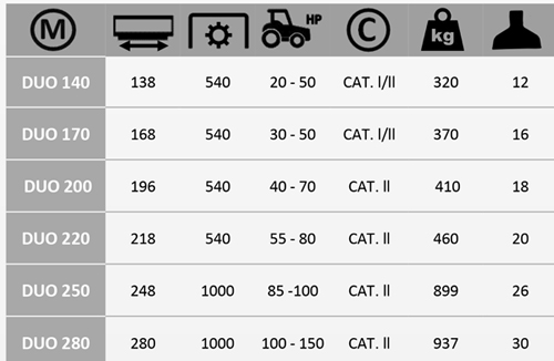 Die Schlegelmulcher mit 140cm - 170 cm Schnittbreite besitzen eine KAT I/II Aufnahme. Die Mulcher ab 200 cm eine KAT II Aufnahme. Den erforderlichen Leistungsbedarf entnehmen Sie bitte der Tabelle.