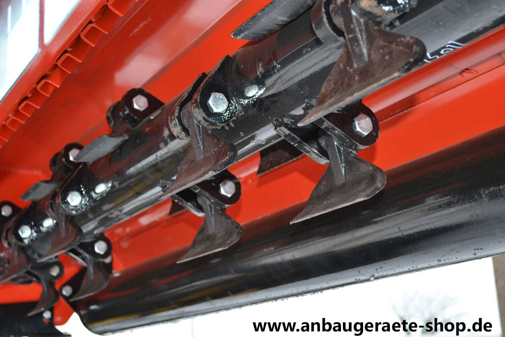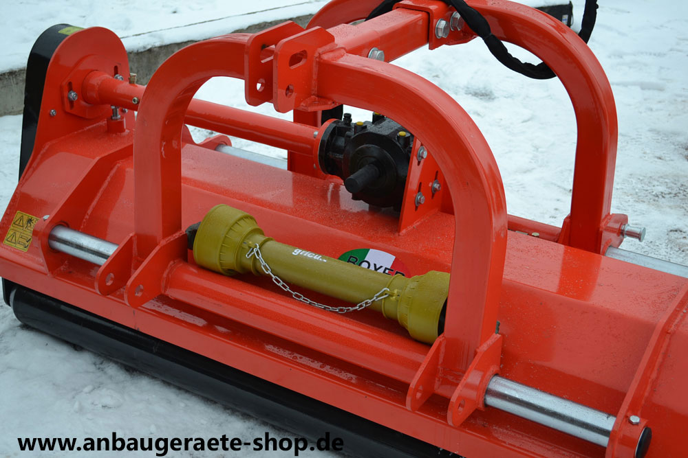 Dieser Schlegelmulcher zeichnet sich durch seine besondere Bauform aus (Wandstärke 8-12 mm, Bleche innen 5 mm). Durch das verstärkte Wechselgetriebe kann dieses Mähwerk an der Front oder dem Heck des Traktors verwendet werden. Die Zapfwelle, die inklusive ist, wird lediglich auf der anderen Seite des Getriebes montiert. Dieser Frontmulcher besitzt 1200g, massive Hammerschlegel die sehr gute Arbeit leisten und das Schnittgut auf ein Minimum zerkleinern. Zusätzlich verfügt der Mulcher über eine schwere Nachlaufwalze und ein Freilaufgetriebe, welches als das schwerste seiner Klasse zählt. Die Schnitthöhe kann leicht, über die seitlich angebrachten Kufen eingestellt werden. Pendelnd aufgehängte, verzinkte Lamellen an der Vorderseite des Mähwerks verhindern das Austreten von Steinen etc..